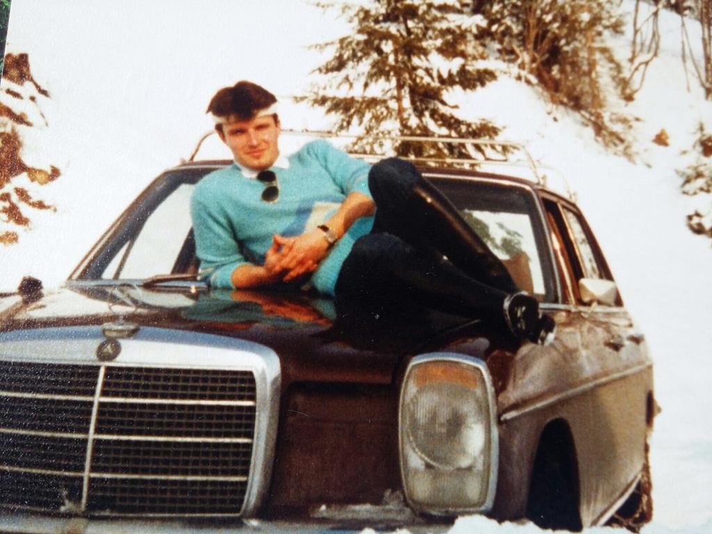 Eines von wenigen Jugendfotos: Ein weltmännisches Lächeln auf den Lippen, Stirnband, eleganter Sweater, Sonnenbrille am Kragen, blankgeputzte Reitstiefel. Er präsentiert sich auf der Kühlerhaube eines luxuriösen Mercedes aus den siebziger Jahren des letzten Jahrhunderts wie in einem Symposion, den Gelagen hedonistischer Griechen des Altertums. Ein Dandy? Ein Schauspieler? Manche seiner Freunde würden ihn so sehen.